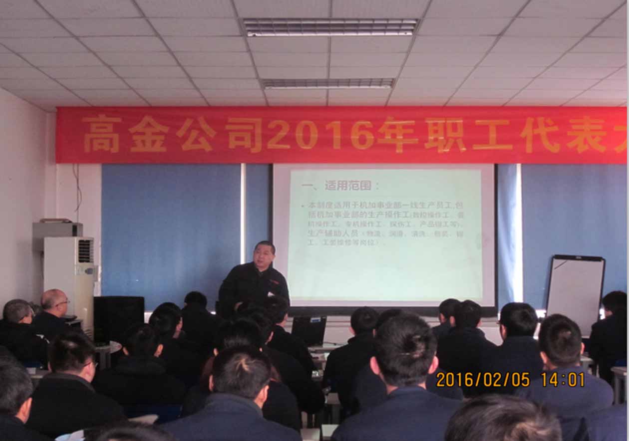 2016年2月5日,重慶高金實業有限公司2016年第一次職工代表大會在二樓培訓室隆重召開,公司黨支部書記兼常務副總經理易小波、生產副總許鋒、總經理助理劉天全、財務部部長敬國仁、工會主席曹興建及公司各部門負責人和職工代表共75人出席了大會。